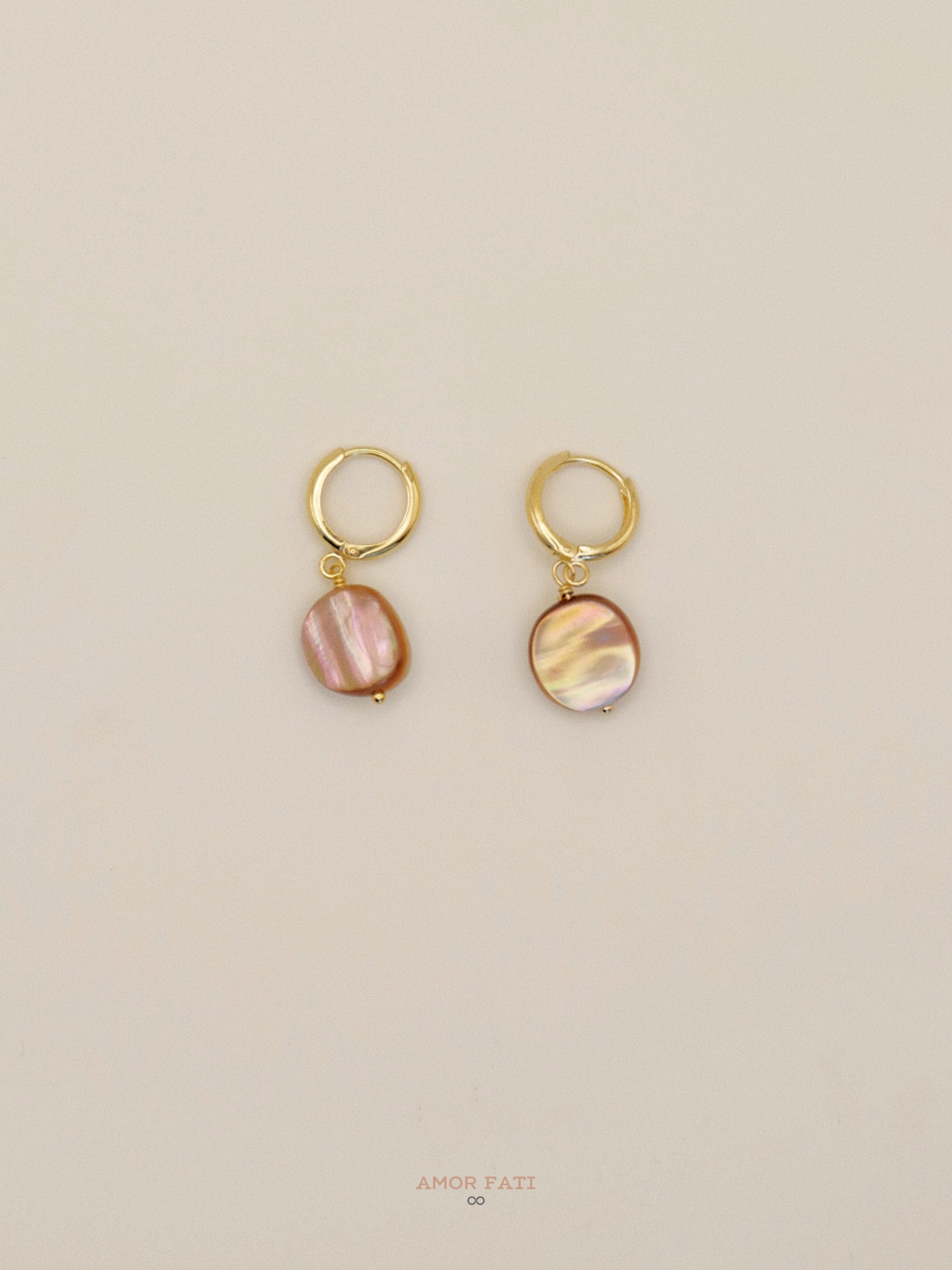 Aurelia captures the sunlit shimmer of seashells—soft pink and golden tones framed in timeless gold-filled hoops. A simple yet radiant piece that carries ocean warmth into everyday elegance.