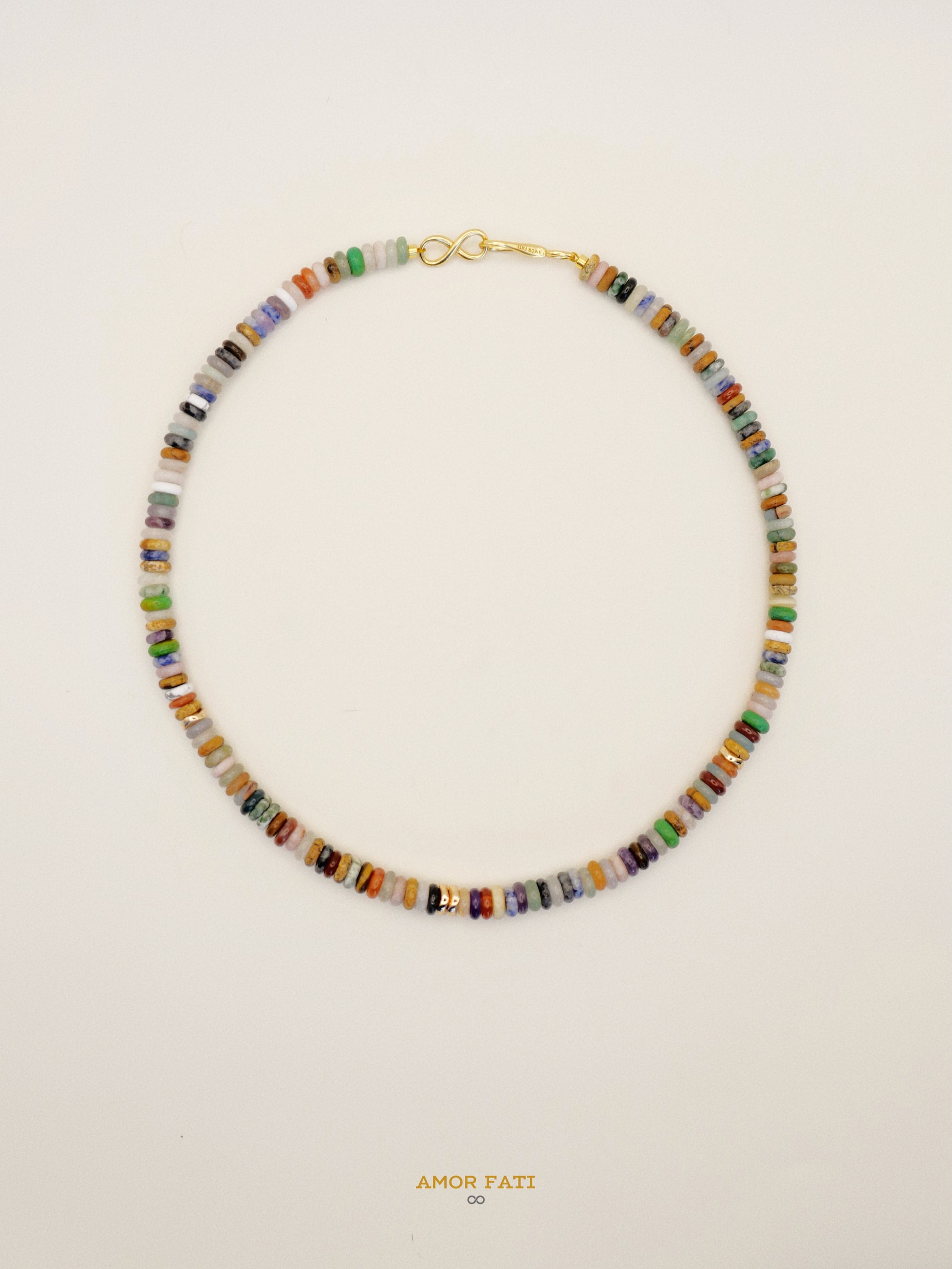 Mirage is a dream of shifting colors—an oasis of vibrant hues captured in natural stone. A playful mix of multicolored gemstones and delicate gold accents, this necklace embodies adventure and illusion, like a fleeting rainbow on the horizon.