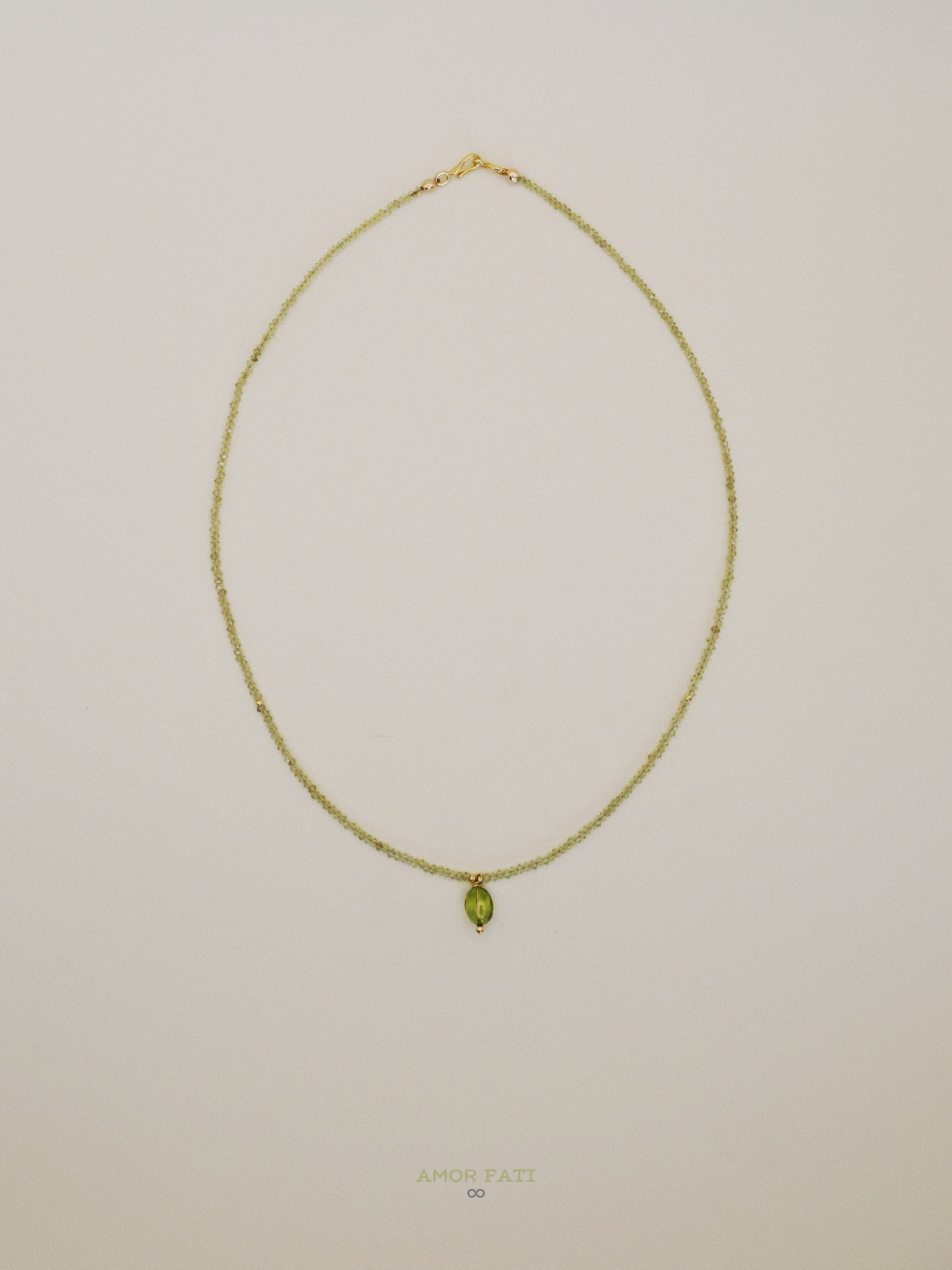 The Green Peridot Necklace embodies the vibrant energy and fresh vitality of green peridot beads, symbolizing growth, renewal, and harmony. The central peridot drop represents the heart of nature, reminding us of the natural beauty and balance that surrounds us.