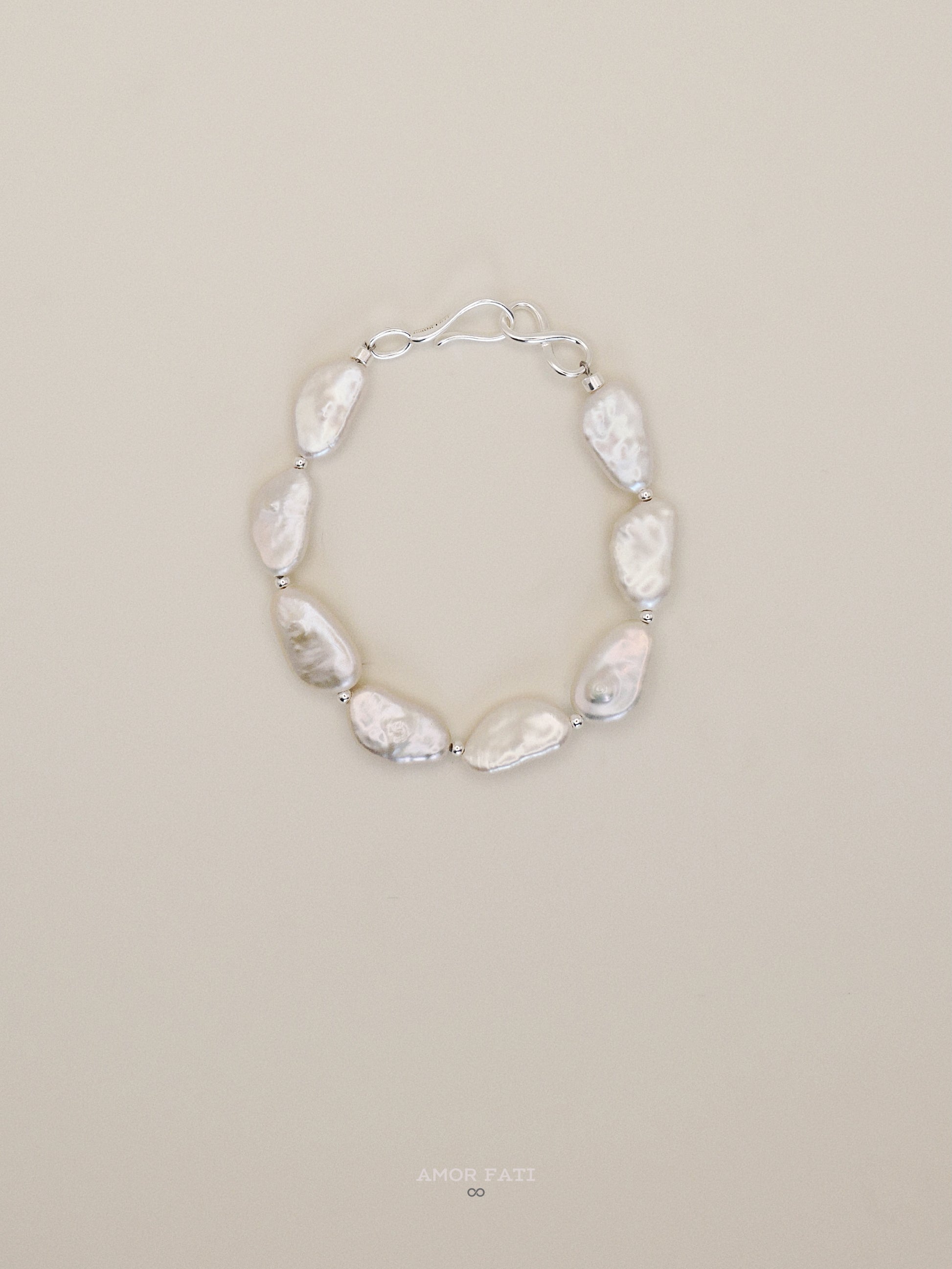 Selene shines with the serene glow of the moon. Featuring natural baroque freshwater pearls, each uniquely shaped by nature, this bracelet reflects quiet elegance and individuality. Accented with sterling silver beads and finished with a graceful hook clasp, it carries a timeless charm that flows effortlessly from day to night.